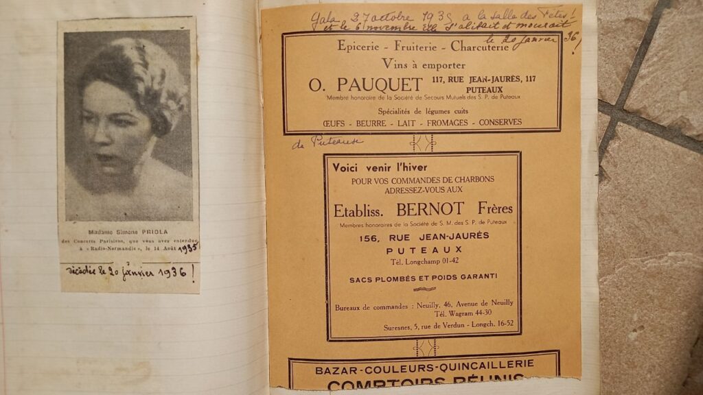 Cadre réalisé en soie par la mère d’un actrice débutante, Simone Priola, morte prématurément. La maman avait réalisé un album photo dans lequel elle parle de sa fille. Sur un document joint, l’annotation suivante : « Gala 27 octobre 1935 à la salle des Fêtes ! et le 6 novembre elle s’alitait et mourait le 20 janver 1936 ! » (ChCC)