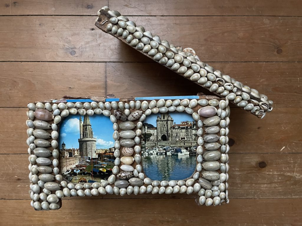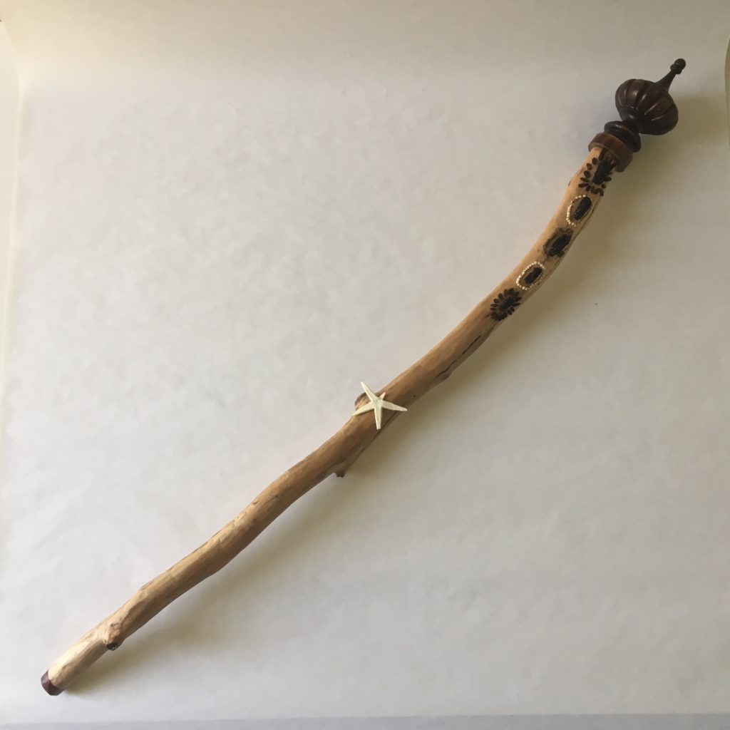 Marc Ivain-Debouchaud, Canne n°8, 2010-2015, pin d’Auvergne, embout de bois de violette, dessus d’amoire en guise de pommeau, cailloux du Vietnam incrustés, étoile de mer rapportée du Vietnam. Vendeur rencontré au vide-grenier de Ladoix-Serrigny (21), en 2018. Coll. Musée du Bricolage. [Renseignements fournis par le vendeur]