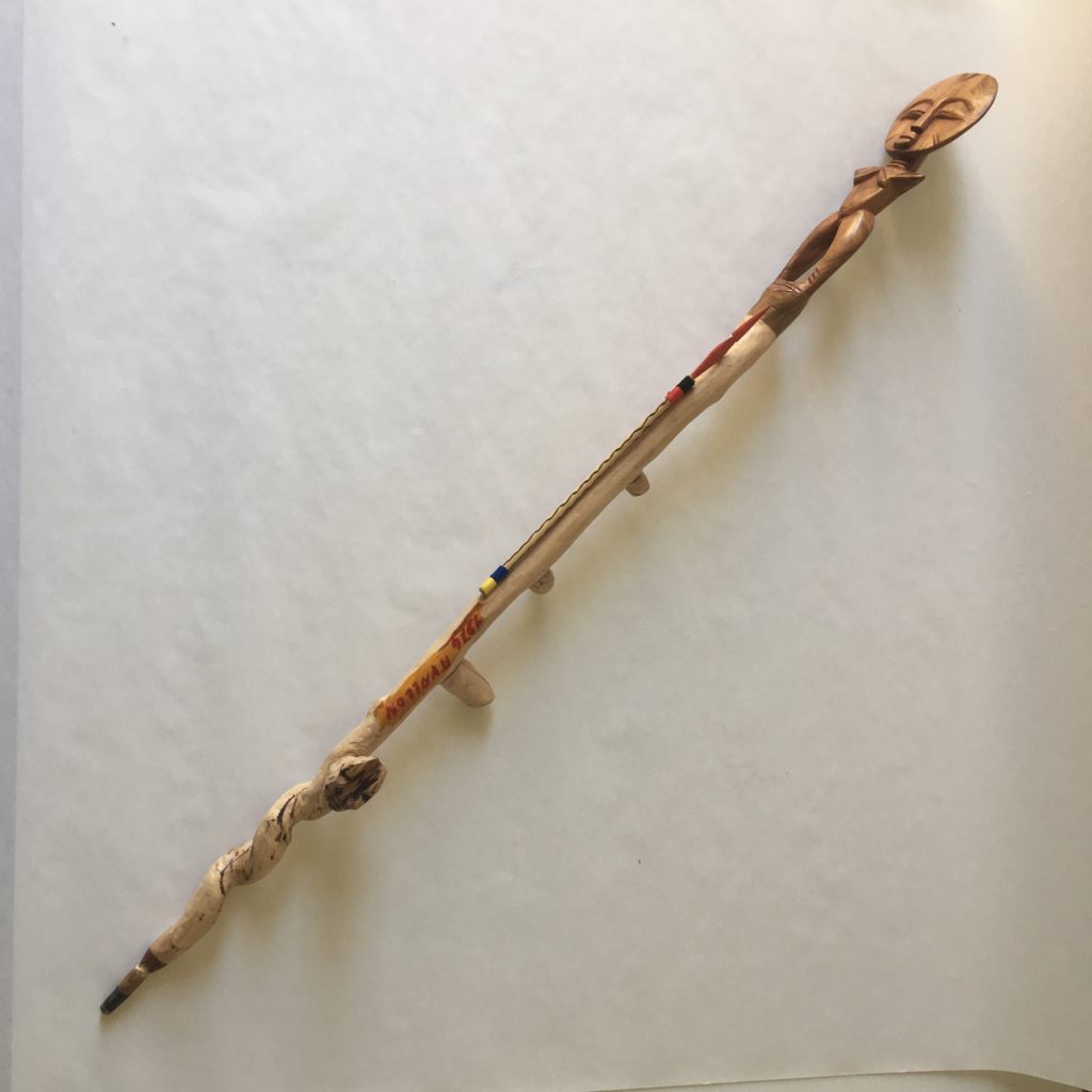 Marc Ivain-Debouchaud, Canne n°4, 2010-2015, bâton trouvé avec inscription « Avallon 1974 », petite statuette récente ajoutée (rapportée du Sénégal en 2005), petite flèche rapportée de Guyanne par des amis, embout de châtaignier, ferrage. Vendeur rencontré au vide-grenier de Ladoix-Serrigny (21), en 2018. Coll. Musée du Bricolage. [Renseignements fournis par le vendeur]