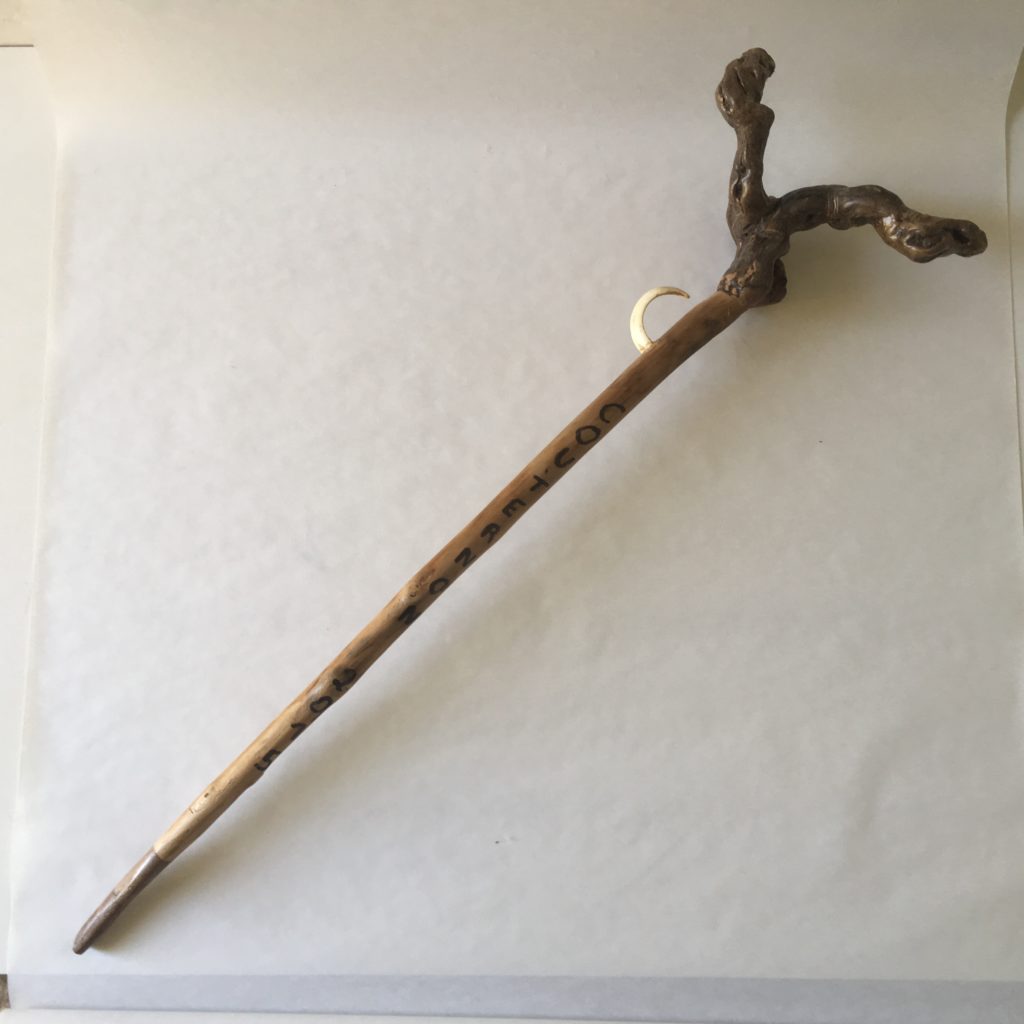 Marc Ivain-Debouchaud, Canne n°7, 2015, bâton ramassé dans les bois de Couternon (21), renfort de châtaignier et bois d’amourette (acheté en lot pour l’armurerie arrêtée en 2006), dent de phacochère rapportée du Vietnam en 2006, cep de vigne. Vendeur rencontré au vide-grenier de Ladoix-Serrigny (21), en 2018. Coll. Musée du Bricolage. [Renseignements fournis par le vendeur]