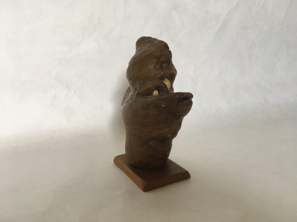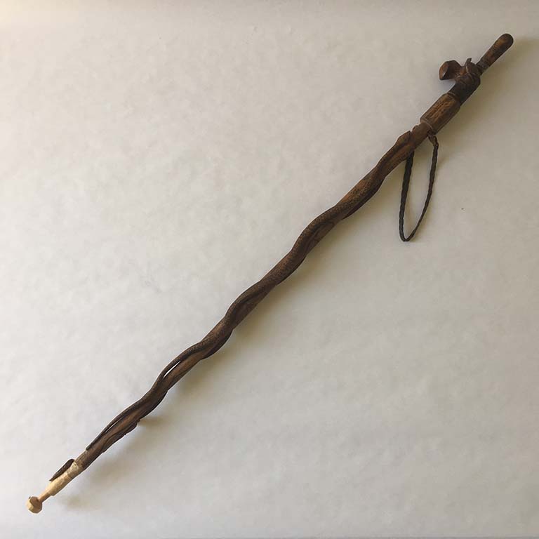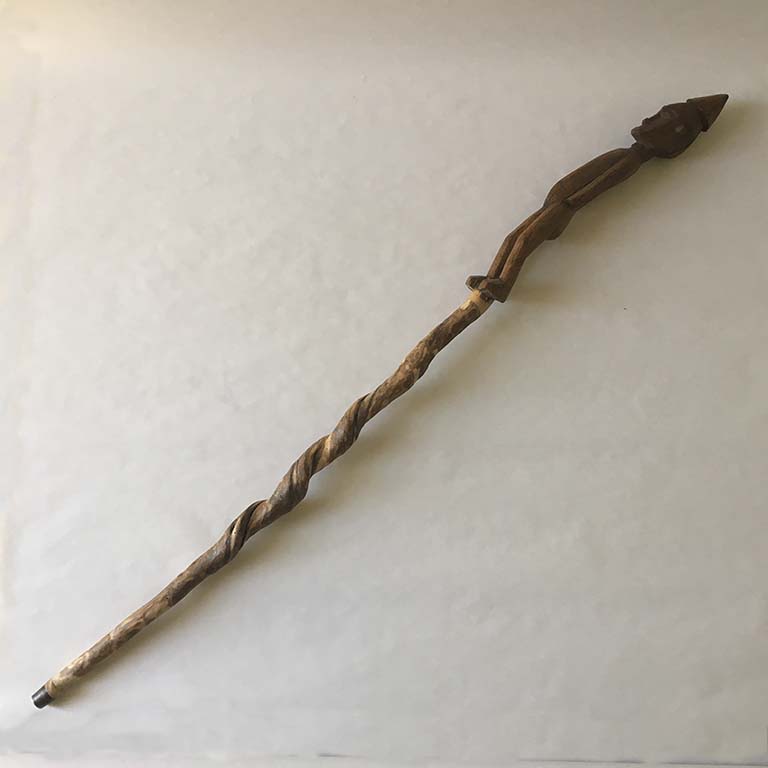 Marc Ivain-Debouchaud, Canne n°2, 2010-2015, bois africain nettoyé des lianes qui y étaient incrustées, rapporté du Sénégal en 2005, statuette africaine ajoutée (achetée en vente aux enchères). Vendeur rencontré au vide-grenier de Ladoix-Serrigny (21), en 2018. Coll. Musée du Bricolage. [Renseignements fournis par le vendeur]