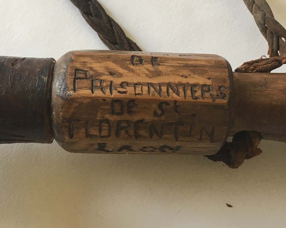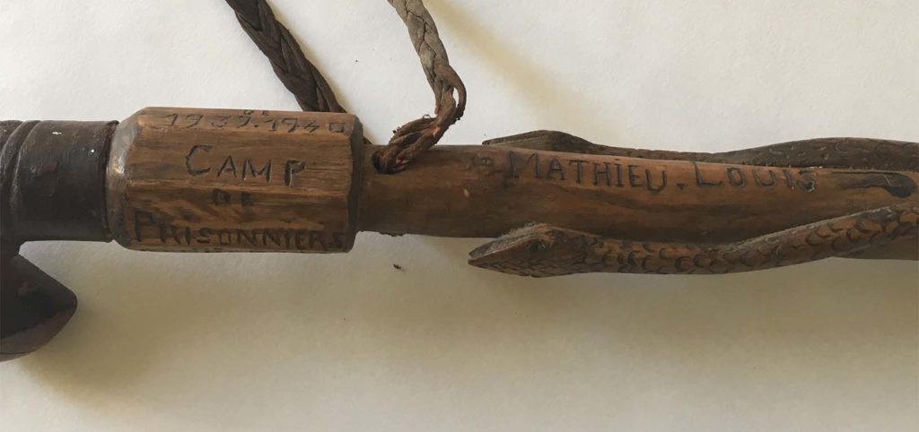 Marc Ivain-Debouchaud, Canne n° 1, vers 2010-2015, canne de prisonnier de la seconde guerre mondiale modifiée : extrémitées ajoutées, queue de serpent ajoutée, vers 2010-2015. Inscription : « Mathieu Louis / souvenir de la guerre de 1939-1940 camp de prisonnier de Saint Florentin Laon ». Acheté à l’auteur rencontré à un vide grenier, 6 mai 2018. Coll. Musée du Bricolage. [Renseignements fournis par le vendeur]
