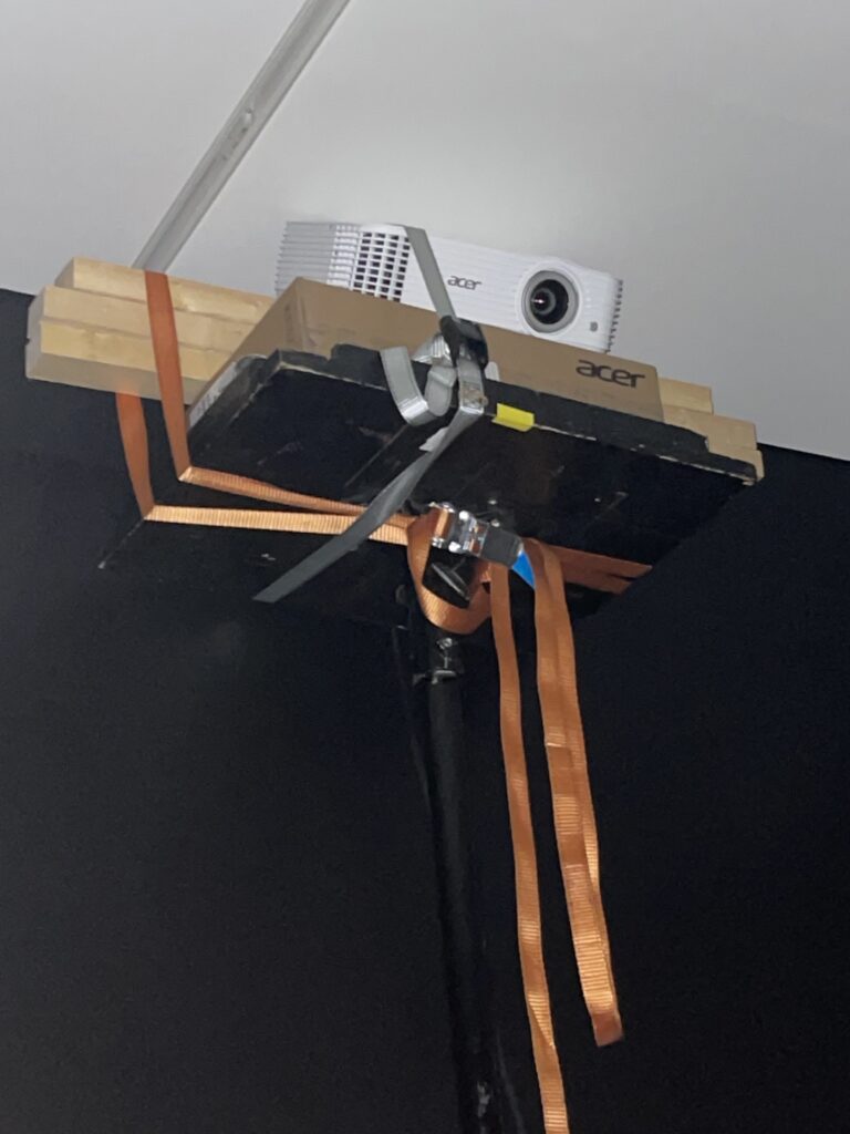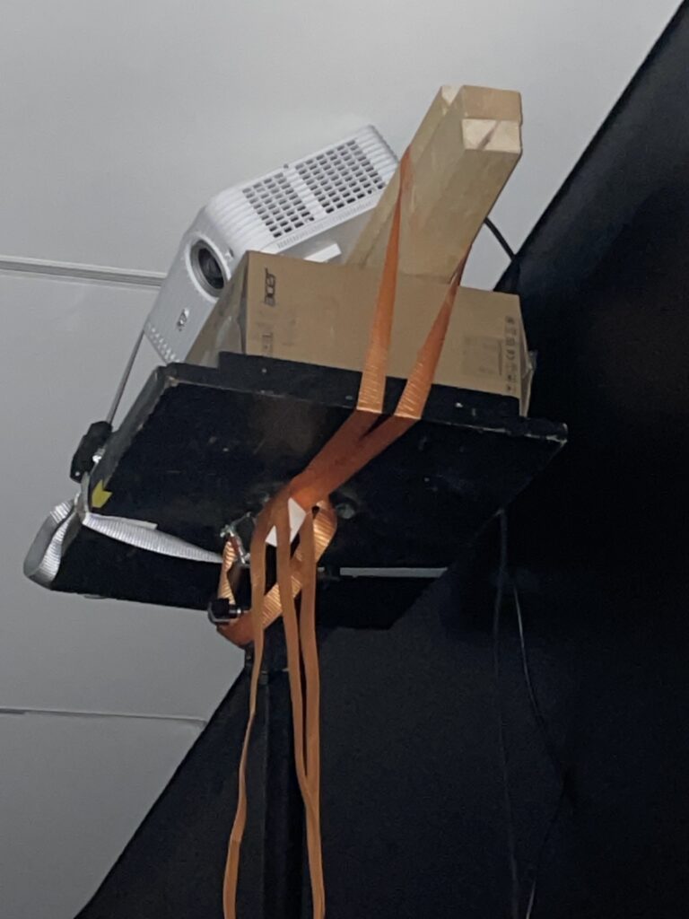 Thomas Bart, Cale pour projecteur, Beauvais, 10 mars 2025, boîte carton, tasseaux, sangle.