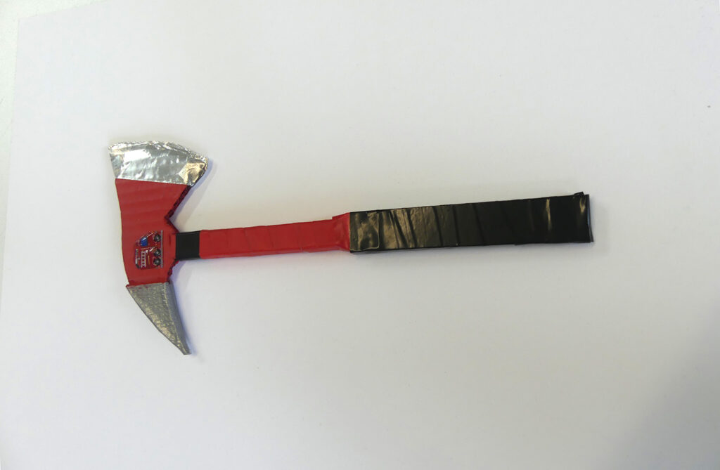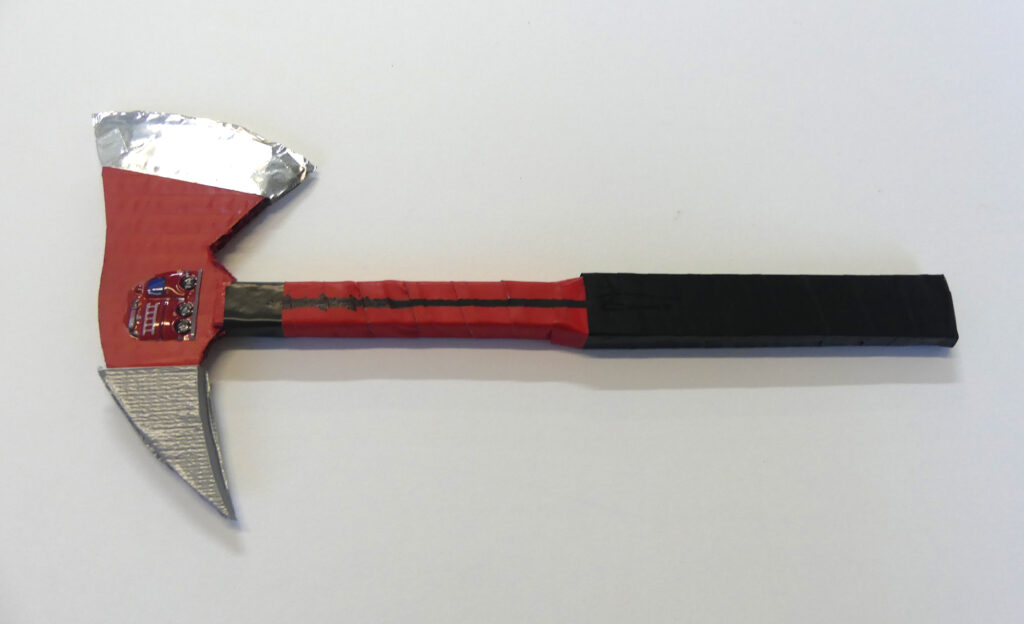 Jean-Marc Cerino, Hache pour déguisement de pompier pour petit-fils, carton bois, carton ondulé et adhésifs.