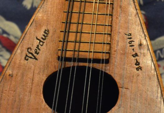 « [Cette mandoline] est restée longtemps dans la famille de son propriétaire d’origine à Clermont Ferrant, elle a été léguée à Claude lors du décès de ce dernier. »