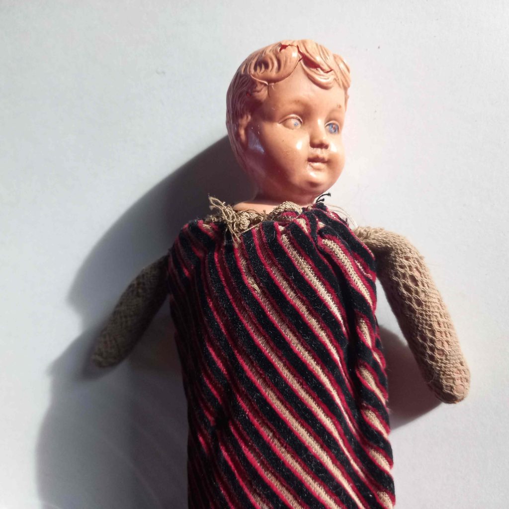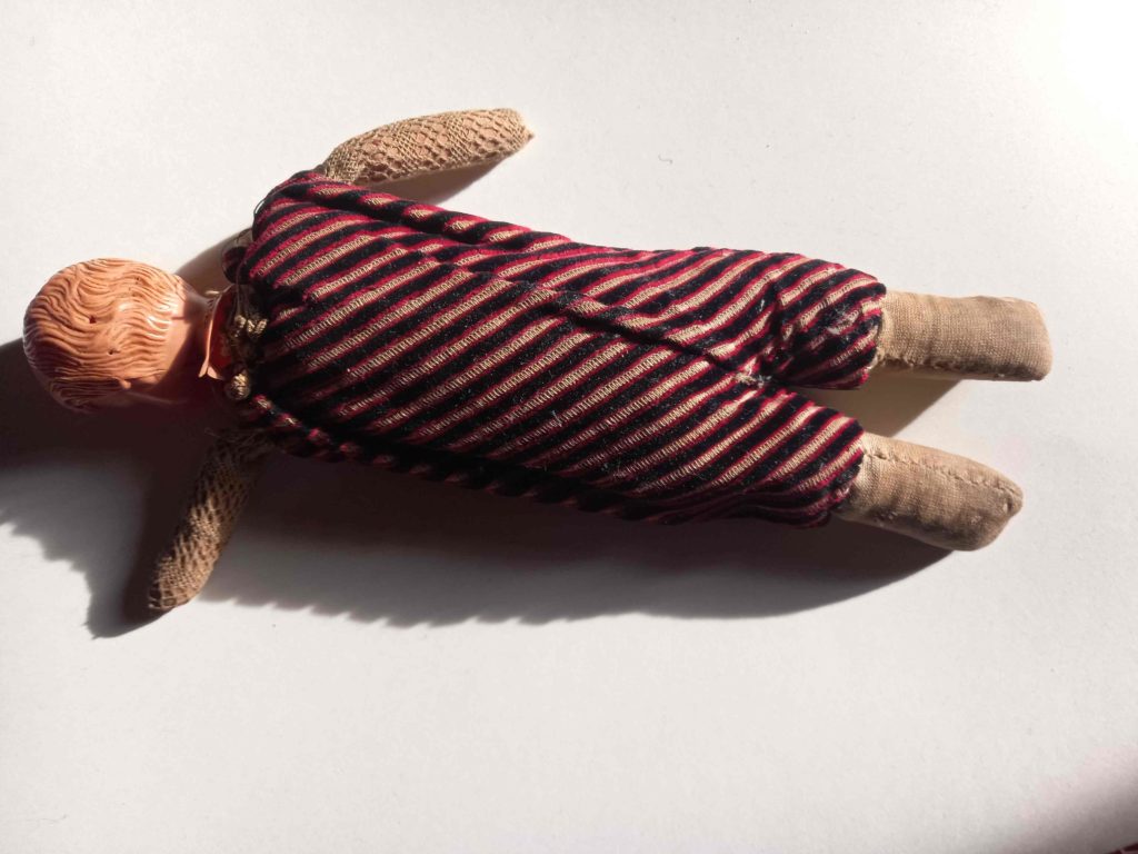 « Poupée constituée d’une tête en celluloïd. Sur l’arrière de la tête : GERMANY imprimé en relief sur le cou avec un motif en forme de hérisson (?) en haut à gauche. Le corps est un tissu rembourré ferme et solide recouvert de velours rayé avec un léger relief que l’on voit apparaître sur l’ombre portée d’une des photos. Les bras rembourrés sont recouverts de dentelle. Le col, très endommagé montre des restes de dentelle. La tête est mal fixée au corps mais elle tient encore solidement. Les jambes sont en tissu neutre.