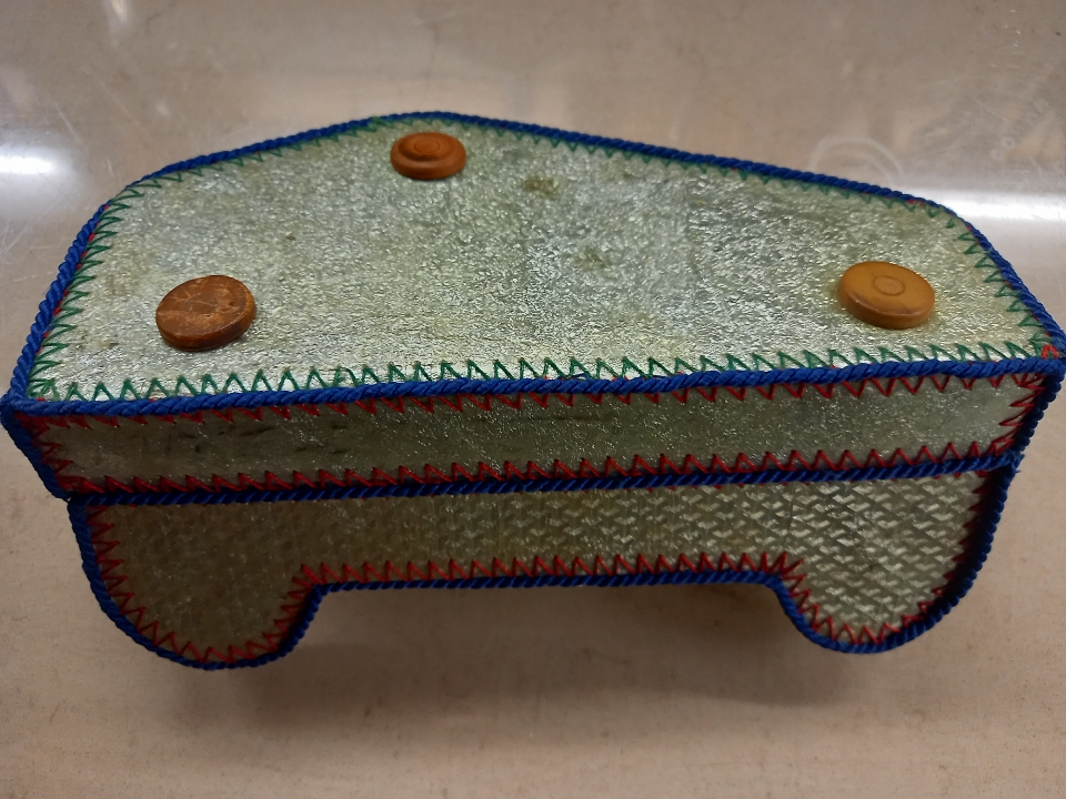 Porte-photo, aluminium recouvrant une structure de carton fort, recouvert par un plastique transparent peint en partie à l’envers, coutures en coton, cordon torsadé bleu foncé collé, des bouchons en caoutchouc tiennent lieu de pieds. Acheté en 2023, dépôt-vente de Chenôve (21). Coll. ChCC.