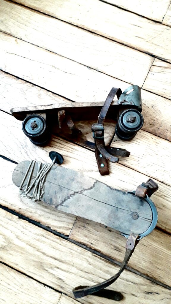 Publié le Patins à roulette Anonyme, Patins à roulettes, vers 1930-1950, bois, cuivre et acier galvanisé, lanières cuir et ficelle. Acheté dans un vide-maison. Coll. AQ.