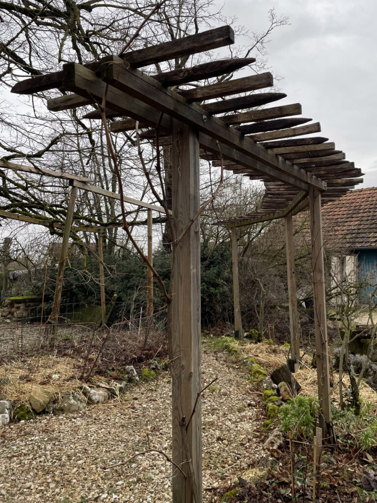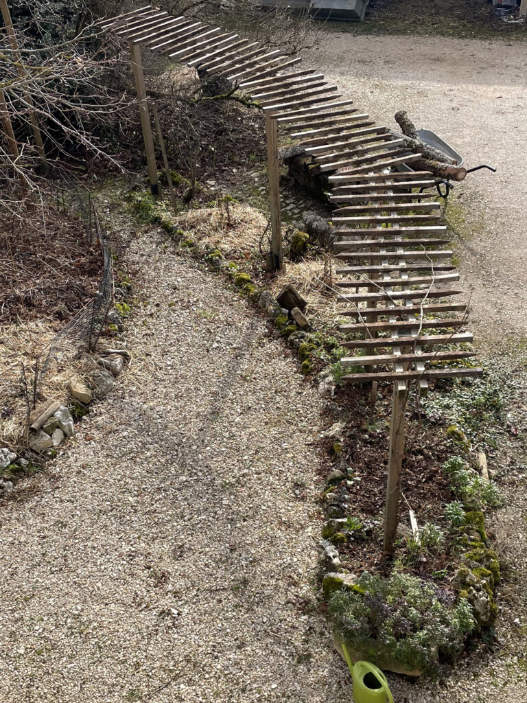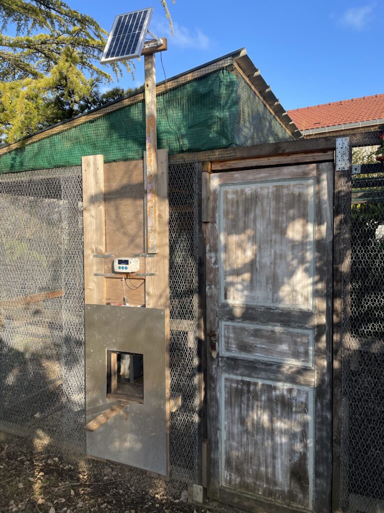 Louis Chatel, Accès protégé au poulailler, porte automatique commandée par cellule photo-électrique, moteur alimenté par panneau solaire (matériel de commerce), entourage métallique pour empêcher les rats d’entrer, perchoir d’accès, grillage à poule enterré, porte piétonne de récupération, Jardin des Cras, Marsannay-la-Côte, printemps 2024.