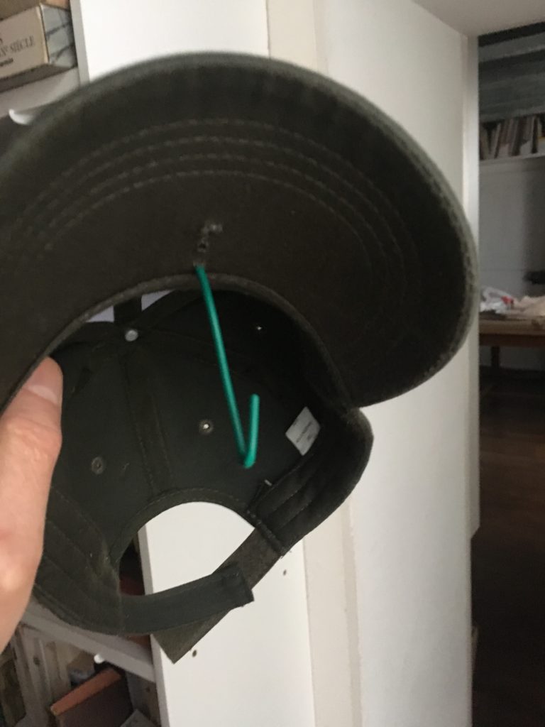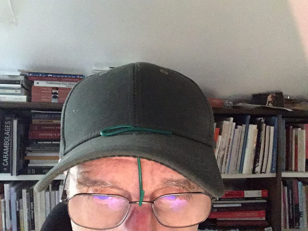 Louis Chatel, Paire de lunettes suspendue, novembre 2019, casquette, crochet métal, paire de lunette dont les plaquettes de nez ont étés supprimées. Fabriqué pour la convalescence d’une opération de carcinome au nez. Coll. ChB